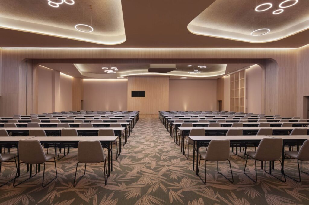 El complejo también tiene un centro de convenciones totalmente equipado, con 1,407 m² de espacio total para eventos. Puede albergar hasta 1,440 personas en formato auditorio, 900 en banquete y 1,000 asistentes en cóctel. A esto se suman múltiples salas divisibles y 5 breakout rooms que permiten configurar desde reuniones ejecutivas hasta convenciones con sesiones simultáneas.