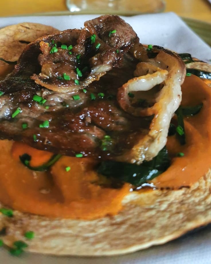 - Furikake de carne seca. / tuétano asado en glace de cebolla